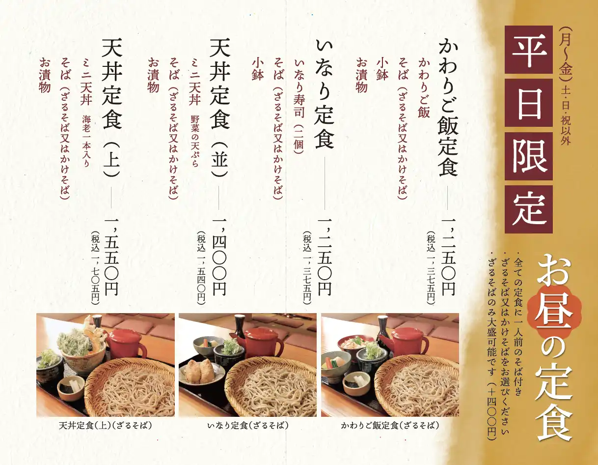 昼 平日限定|月~金(土・日・祝以外) ・すべての定食に一人前のそば付き ・ざるそば又はかけそばをお選びください ・ざるそばのみ大盛可能です(+400円) ◆かわりご飯定食 かわりご飯 そば(ざるそば/かけそば) 小鉢 お漬物 ◆いなり定食 いなり寿司(二個) そば(ざるそば/かけそば) 小鉢 ◆天丼定食(並) ミニ天丼[野菜の天ぷら] そば(ざるそば/かけそば) お漬物 ◆天丼定食(上) ミニ天丼[海老一本入り] そば(ざるそば/かけそば) お漬物 Post Share 冷たい おそば 前の記事 ご飯もの 次の記事 メニュー 蕎麦掻き 夜のお食事〔久居店〕 甘味 飲物